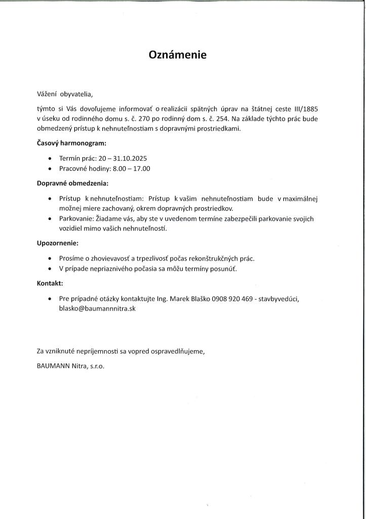 Firma Baumann Nitra, s.r.o. oznamuje, že z dôvodu úprav a asfaltovania na št.ceste III/1885 bude obmedzený prístup k nehnuteľnostiam dopravnými prostriedkami od RD č. 270 po RD č.254 od 20. -31.10.2025 v čase od 8:00 do 17:00 hod. V prípade otázok kontaktujte Ing. Blaška na tel.č. 0908 920 469.