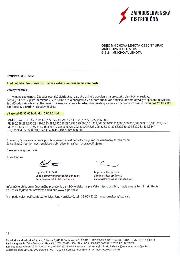 ZSE oznamujú, že 25.8.2022 v čase od 7,30 do 15,00 hod. budú bez el. energie RD od súp.č. 172 - 181, od 286 - 394, 406, 412, 431.