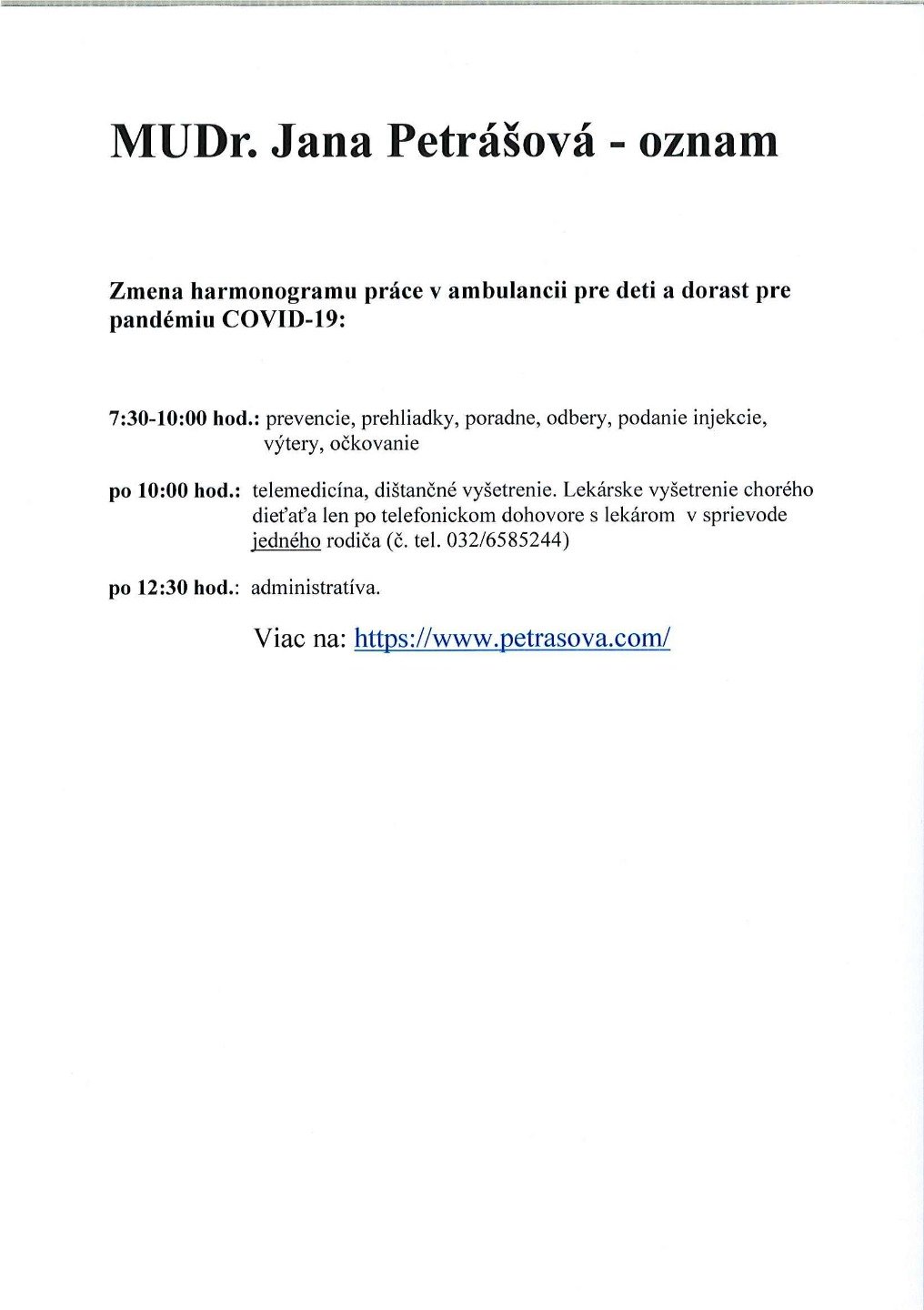 Zmena harmonogramu práce v ambulancii pre pandémiu COVID- 19_ MUDr. Petrášová