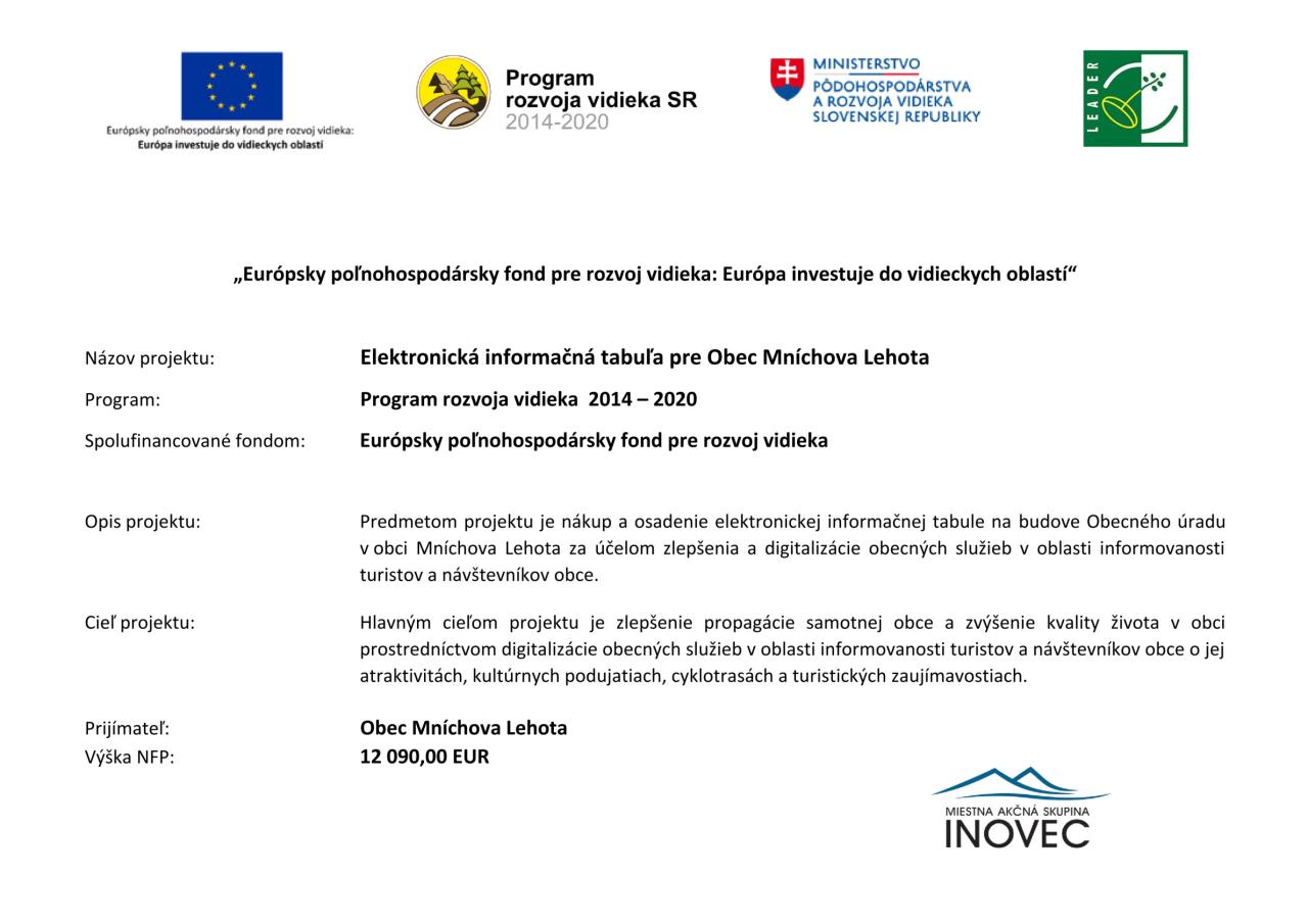 Predmetom projektu je nákup a osadenie elektronickej informačnej tabule na budove Obecného úradu v obci Mníchova Lehota za účelom zlepšenia a digitalizácie obecných služieb v oblasti informovanosti turistov a návštevníkov obce.